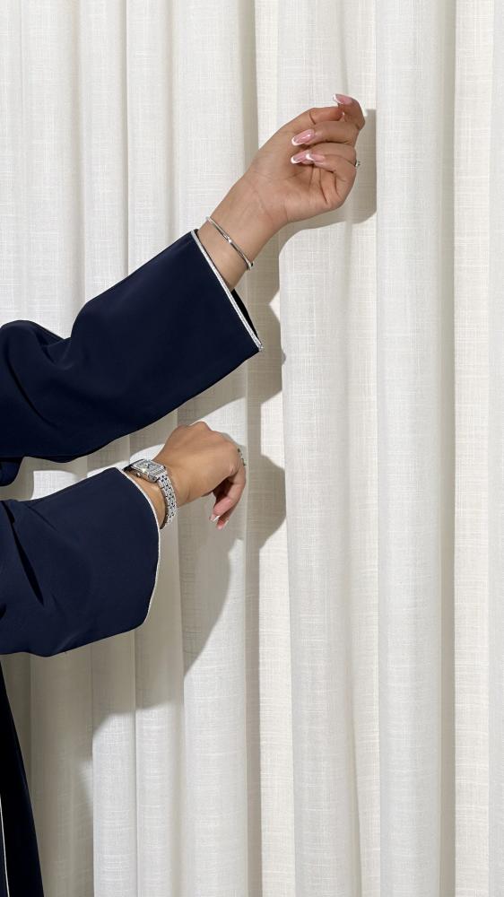 عباية أنيقة باللون الكحلي الغامق تمنحك إطلالة متألقة تجمع بين الرقي والبساطة. أطرافها الناعمة والمميزة تضيف لمسة من الأناقة والتميز لكل حركة، مما يجعلها خيارًا مثاليًا للمناسبات الرسمية واليومية على حد سواء. القماش الفاخر يوفر الراحة والخفة أثناء الارتداء، بينما التفاصيل الدقيقة عند الأطراف تمنح العباية طابعًا فنيًا فريدًا.
